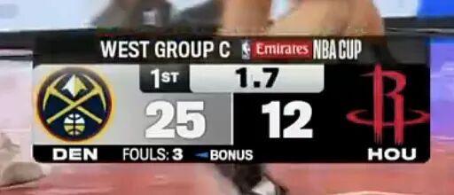 单节打完,火箭仅得12分,命中 率 25% , 掘金25分算是及格线徘徊。
