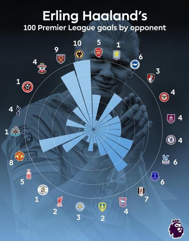 这100粒进球来自408次射门,预期进球值为93.5,实际产出略高于预期。其中71球由左脚攻入,右脚进球为11个,头球破门17次。此外,他还在2023年11月对阵切尔西的比赛中,用身体其他部位(疑似臀部)撞进一球。